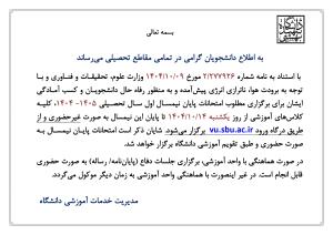 شایان ذکر است امتحانات پایان نیمسال جاری به صورت حضوری و طبق تقویم آموزشی دانشگاه برگزار خواهد شد.