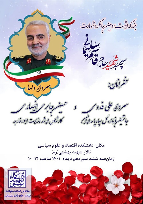 مراسم بزرگداشت سومین سالگرد شهادت سپهبد حاج قاسم سلیمانی برگزار می شود 2271 بازدید print share مراسم بزرگداشت سومین سالگرد شهادت سپهبد حاج قاسم سلیمانی؛ سه شنبه 13 دی ماه، 1401 برگزار میشود. این...